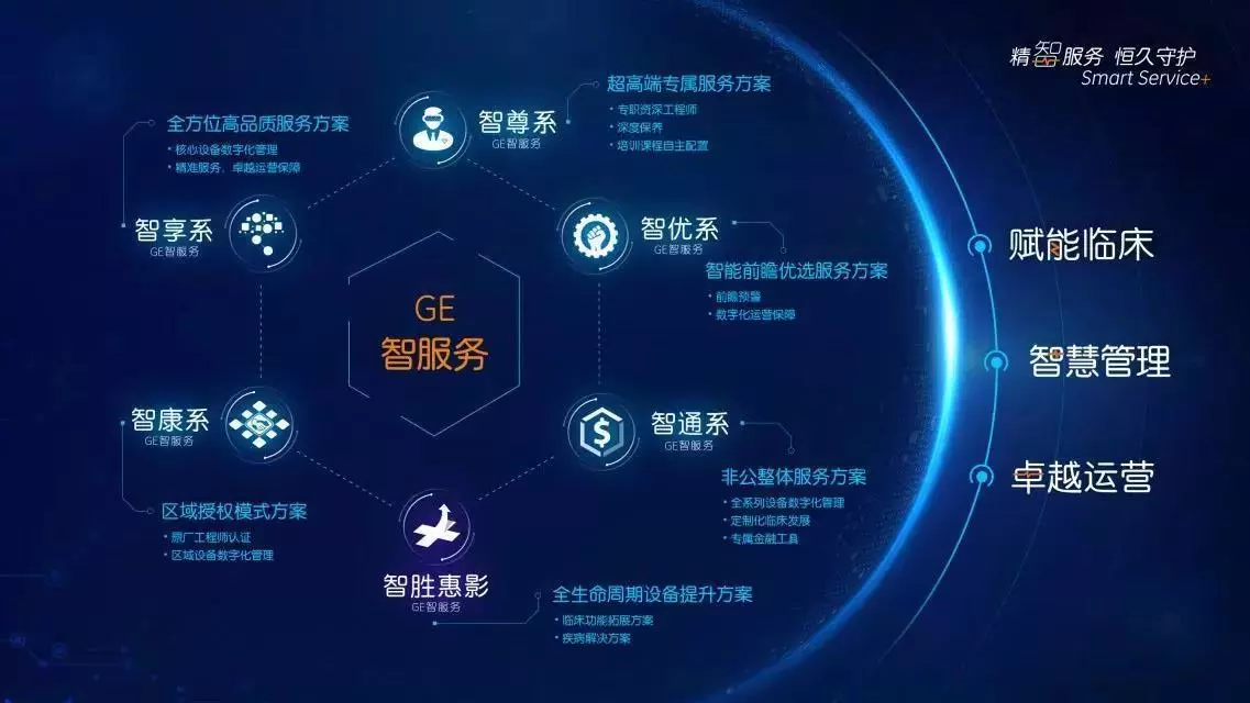 GE醫(yī)療客戶服務(wù)部推出全新升級的“精智服務(wù),恒久守護(hù)”數(shù)字化服務(wù)戰(zhàn)略,并在數(shù)字化戰(zhàn)略升級平臺基礎(chǔ)上針對不同的客戶需求向市場推出全新升級的“GE智服務(wù)”六大方案:智尊系、智享系、智優(yōu)系、智康系、智通系、智勝惠影。