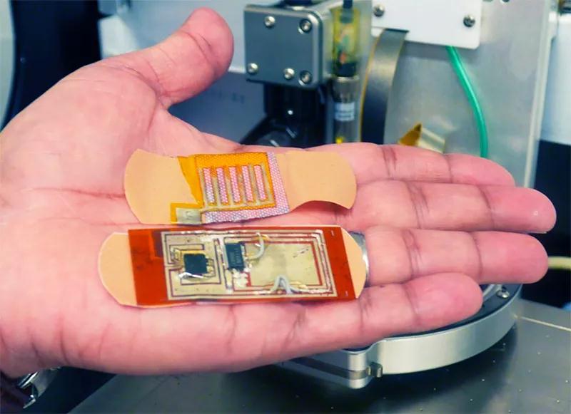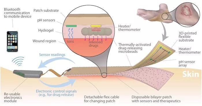 這種類型也是智能繃帶,它能通過電子元件記錄潰瘍形成、感染、氧氣、壓力、溫度、濕度、血糖水平來評(píng)估傷口的愈合進(jìn)度,幫助醫(yī)生及時(shí)做出決定。