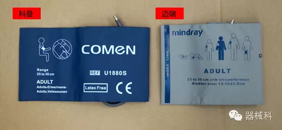 兩家都采用防水面料和薄膜氣囊??坡伾?,不知道是不是因?yàn)樯钌团K。袖套看起來要厚點(diǎn),不過摸起來也一樣柔軟。邁瑞是不經(jīng)臟的白色,拿起來會發(fā)現(xiàn)更柔軟?;蛟S是深色顯得明亮,對比之下,總覺得邁瑞的袖套看起來舊舊的。