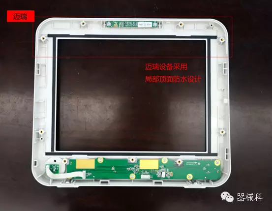 防水是所有電子類產(chǎn)品的一個重要功能。如果防水功能設(shè)計不好,儀器很容易受潮,從而引起使用不便,嚴(yán)重的將會報廢??坡昂髿ぶg采用硅膠密封線整圈的防水設(shè)計,做工更麻煩,耗材多,但更安全;邁瑞前后殼之間采用硅膠密封線頂部的局部防水設(shè)計,省時省料,但存在安全隱患。