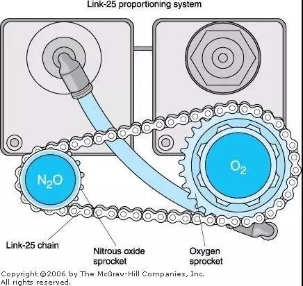為了防止麻醉機(jī)輸出低氧性的氣體,麻醉機(jī)還有流量計(jì)聯(lián)動(dòng)裝置和氧比例監(jiān)控裝置,使新鮮氣體出口輸出的最低氧濃度保持在25%左右。采用的是齒輪聯(lián)動(dòng)的原理。在N?O流量計(jì)鈕上,倆齒輪之間用鏈條連接,O?旋轉(zhuǎn)一圈,N?O旋轉(zhuǎn)兩圈。當(dāng)單獨(dú)旋開O?流量計(jì)針型閥時(shí),N?O流量計(jì)保持不動(dòng);當(dāng)旋開N?O流量計(jì)時(shí),O?流量計(jì)隨之聯(lián)動(dòng);兩個(gè)流量計(jì)均打開時(shí),逐漸關(guān)閉O?流量計(jì),N?O流量計(jì)也隨之聯(lián)動(dòng)下降。