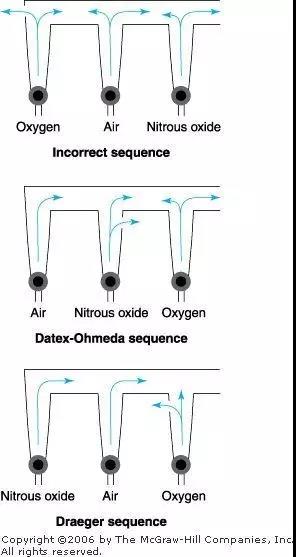 另外,不知道大家有沒有觀察過流量計(jì)的順序問題,其實(shí)這也有講究。也就是把氧流量計(jì)安裝在最靠近共同出口處,萬(wàn)一在氧上風(fēng)位發(fā)生的漏口,這樣流失的大部分是N?O或者空氣,O?損失最少。當(dāng)然,它的順序也不能保證不發(fā)生因流量計(jì)破裂所致的低氧。