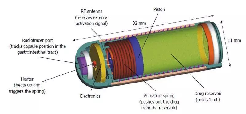 當(dāng)彈簧釋放時(shí),Enterion能夠通過(guò)9毫米開(kāi)口輸送任何類型的藥物配方(包括干粉,半固體,懸浮液或溶液配方),迫使活塞沿著膠囊的軸移動(dòng),從而,清空所述容器到胃腸道的特定位置。將放射性標(biāo)記物放置在單獨(dú)的密封示蹤劑端口內(nèi),以允許使用γ閃爍掃描法實(shí)時(shí)觀察膠囊位置?;钊倪\(yùn)動(dòng)還操作開(kāi)關(guān),該開(kāi)關(guān)以精確的頻率傳輸弱無(wú)線電信號(hào)。這個(gè)信號(hào)的檢測(cè)從外部確認(rèn)膠囊已成功。活塞運(yùn)動(dòng)在膠囊末端附近停止,這保持了密封并防止內(nèi)部電子元件與GI流體接觸。