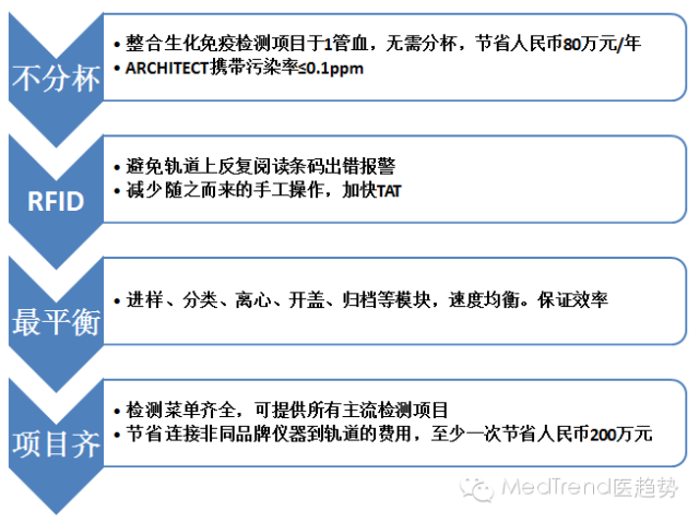 縱觀IVD國(guó)際品牌的發(fā)展歷程,都是從低速生化朝高速生化發(fā)展,由單機(jī)朝向集成化、自動(dòng)化、流水線的方向發(fā)展。由于中國(guó)病人的過(guò)度集中于大型三級(jí)醫(yī)院,年收入超過(guò)10億的醫(yī)院每天樣本量超過(guò)1000個(gè),高速儀器是高端醫(yī)院的剛需,因此研發(fā)高速儀器的能力也是未來(lái)進(jìn)入大型公立醫(yī)院的前提要求,流水線、生化免疫聯(lián)機(jī)是大勢(shì)所趨。
