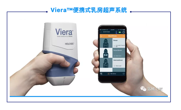 POCUS進(jìn)入乳房成像的另一個(gè)例子是2018年Hologic新推出的Viera?便攜式乳房超聲系統(tǒng)。無(wú)線超聲掃描儀為醫(yī)生提供了早期診斷和優(yōu)化臨床工作流程的機(jī)會(huì)。它可以指導(dǎo)介入程序,如活組織檢查,標(biāo)記放置和電線本地化。它還可以將乳房圖像傳輸?shù)街悄茉O(shè)備或PACS。