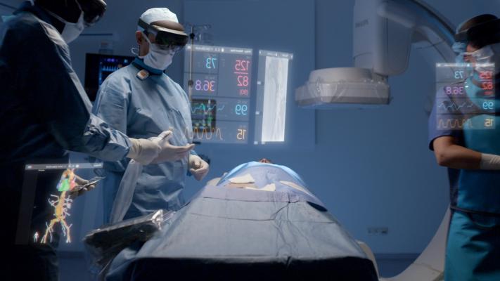 在微創(chuàng)手術(shù)過(guò)程中,醫(yī)生不能直接看到和觸摸治療區(qū)域,而是依靠先進(jìn)的醫(yī)學(xué)成像技術(shù),如超低劑量X射線成像和超聲波,以及其他導(dǎo)航技術(shù),觀察患者身體內(nèi)部并引導(dǎo)專用器械的行動(dòng)。飛利浦和微軟為HoloLens 2開發(fā)的增強(qiáng)現(xiàn)實(shí)概念(augmented reality concept),將目前顯示在大型2D屏幕上的重要數(shù)據(jù)的實(shí)時(shí)成像和其他來(lái)源,轉(zhuǎn)化為一種3D全息增強(qiáng)現(xiàn)實(shí)環(huán)境,這種環(huán)境可以被醫(yī)生以人體工程學(xué)的方式輕松直觀地控制。