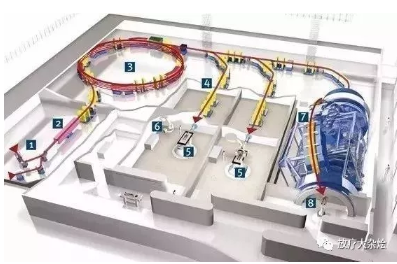 3. 同步加速器:六個(gè)60°磁鐵將離子束彎曲成圓形路徑。在大約一百萬(wàn)個(gè)軌道中,離子被加速到高達(dá)75%的光速。